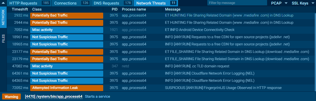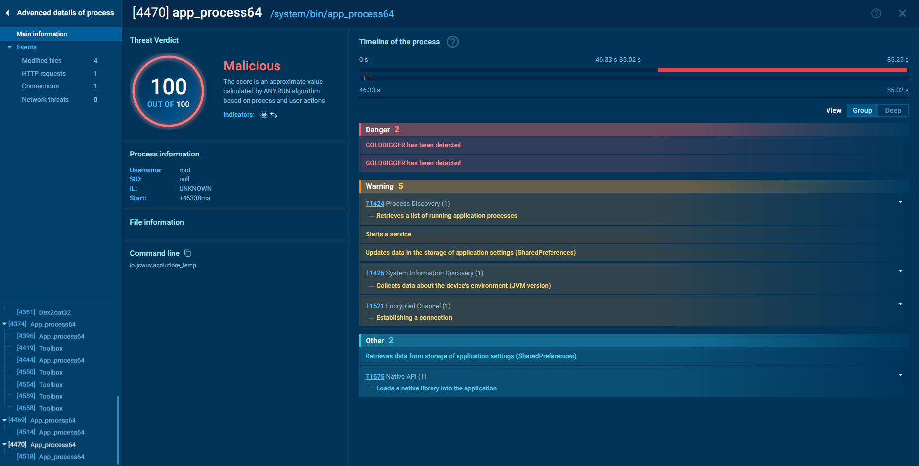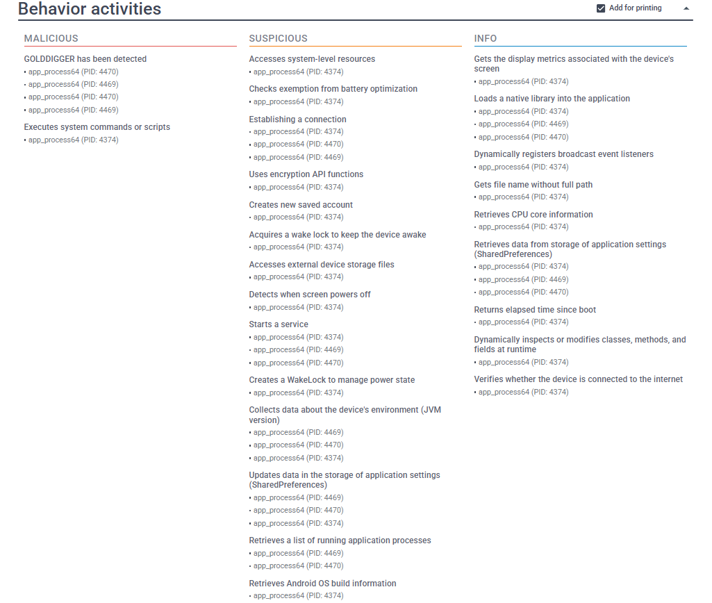 From the process analysis during execution, the sample spawns /system/bin/app_process64, a legitimate Android runtime component responsible for launching and executing application code. On a normal device, this process is expected. In this case, however, it appears to be leveraged by the malware. The spawning of app_process64 in this context suggests the sample is abusing the Android runtime to execute dynamically loaded or injected code. This technique is commonly used to reduce static detection and to maintain control over the runtime behavior. By blending into legitimate system processes and interacting closely with Android's runtime environment, the malware improves its evasion and persistence capabilities.