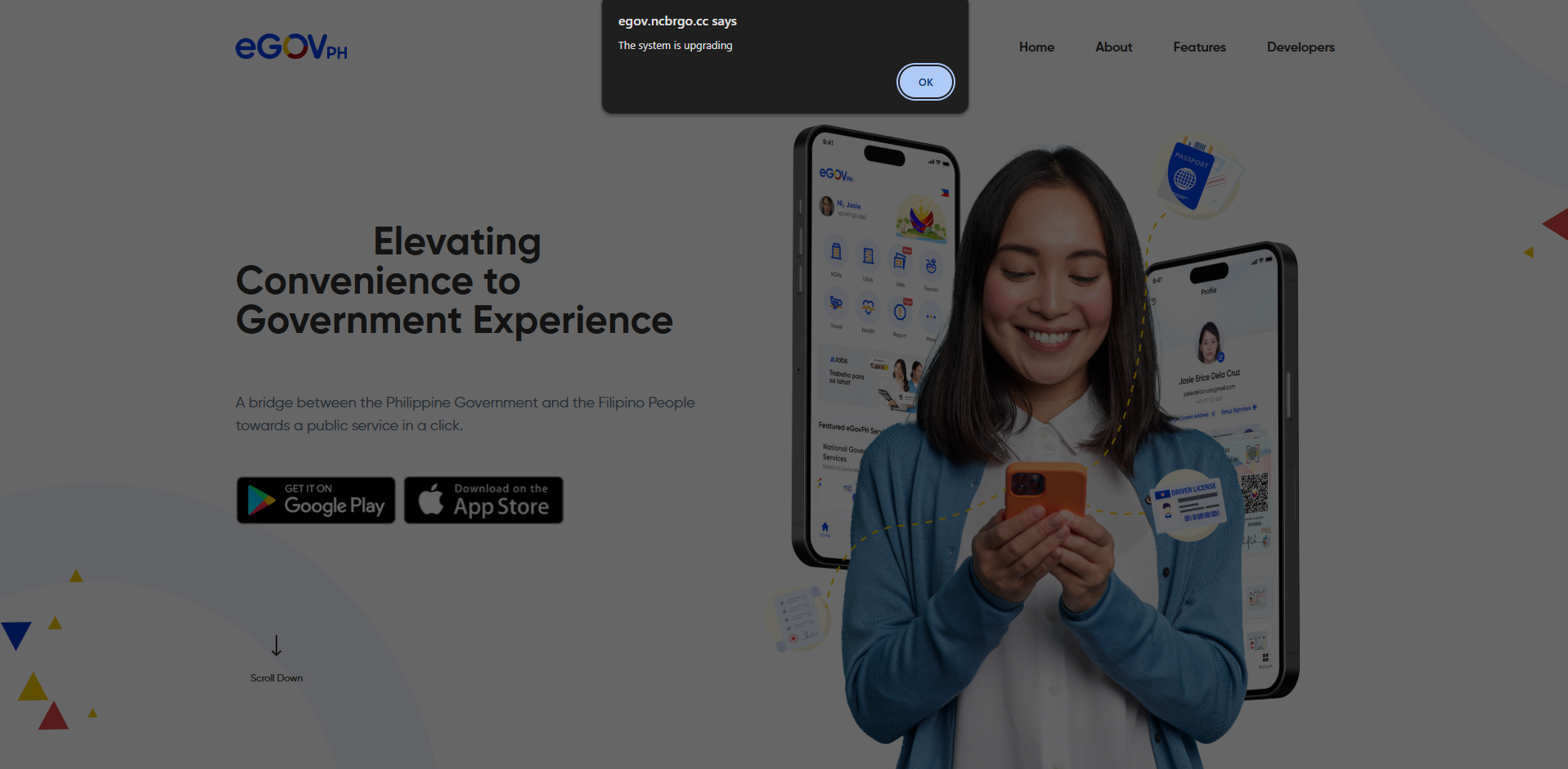 I looked into the matter and this is not just your typical phishing campaign. It is a threat campaign that uses social engineering to trick victims into installing a custom crafted malicious APK designed for credential harvesting. The link sent during the call pointed to https://egov.ncbrgo.cc/. The page visually resembles the eGovPH website, but upon further inspection, there are indicators suggesting the site may have been created with the help of an LLM. For example, the "Download on the App Store" option triggers a fake system upgrade message instead of redirecting to the actual App Store.